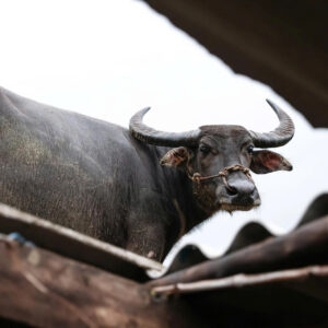 Sau gần một tuần mắc kẹt trên trên mái nhà, chú trâu đã được quân đội và người dân giải cứu thành công…