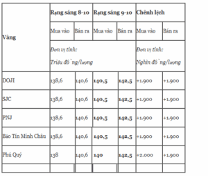 Giá vàng miếng trong nước cập nhật sáng 9-10 như sau: